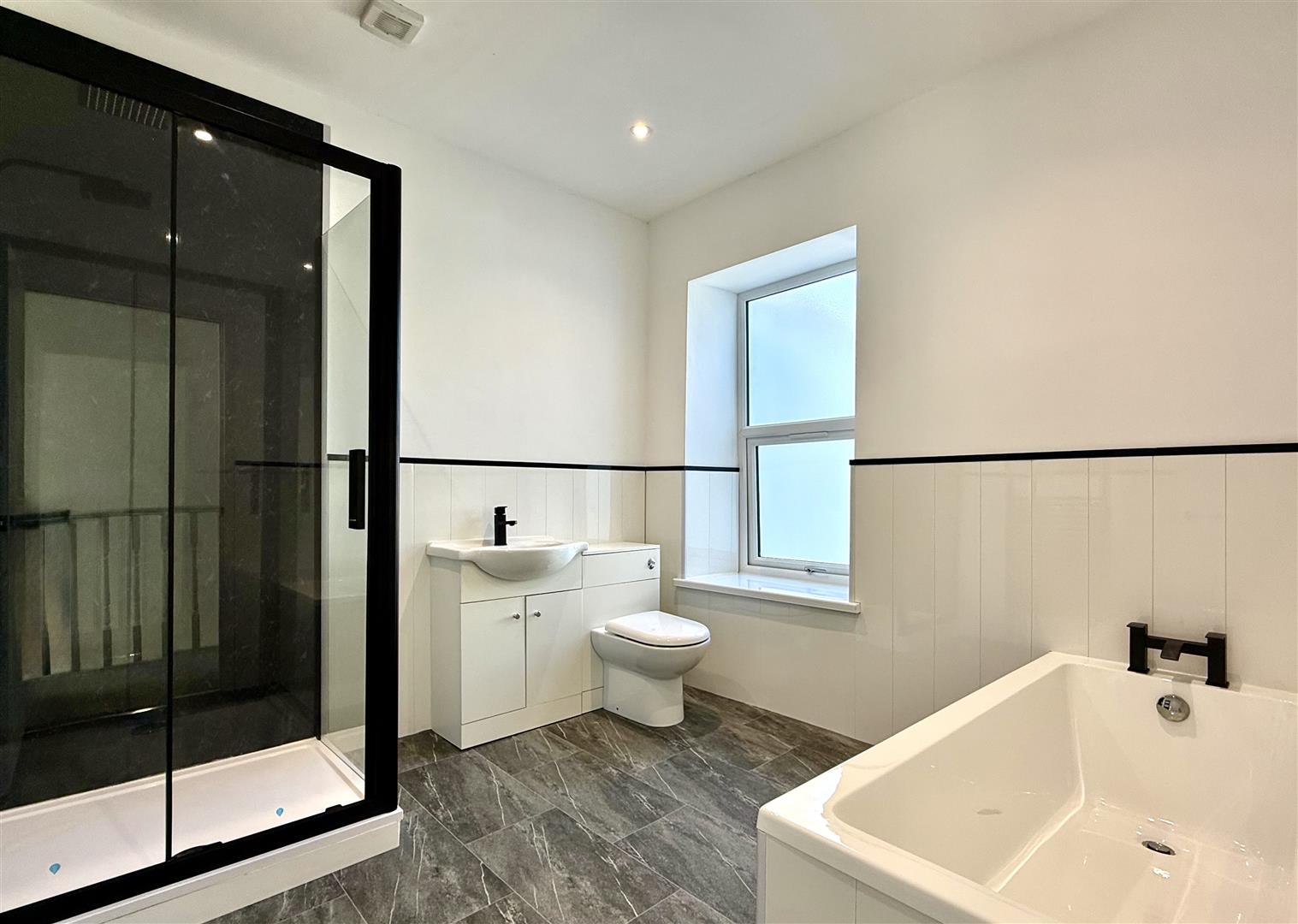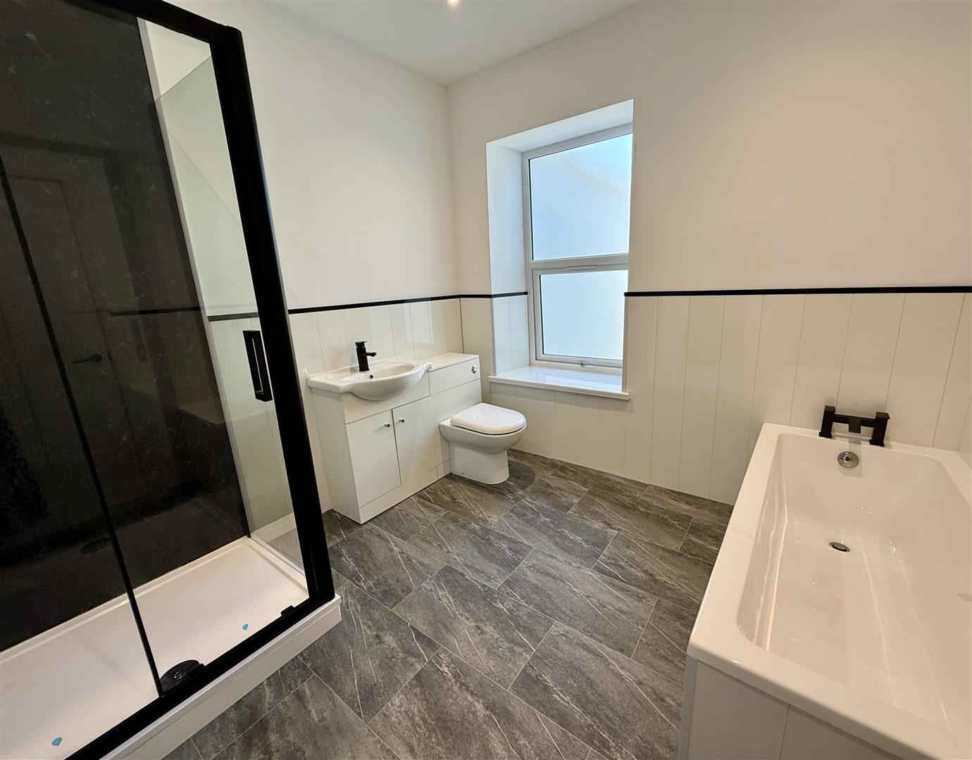 Brand new fitted four piece bathroom suite compromising of shower cubicle, bath, vanity sink and W.C., unit. uPVC double glazed window facing rear with obscure glass, feature heated towel rail.
