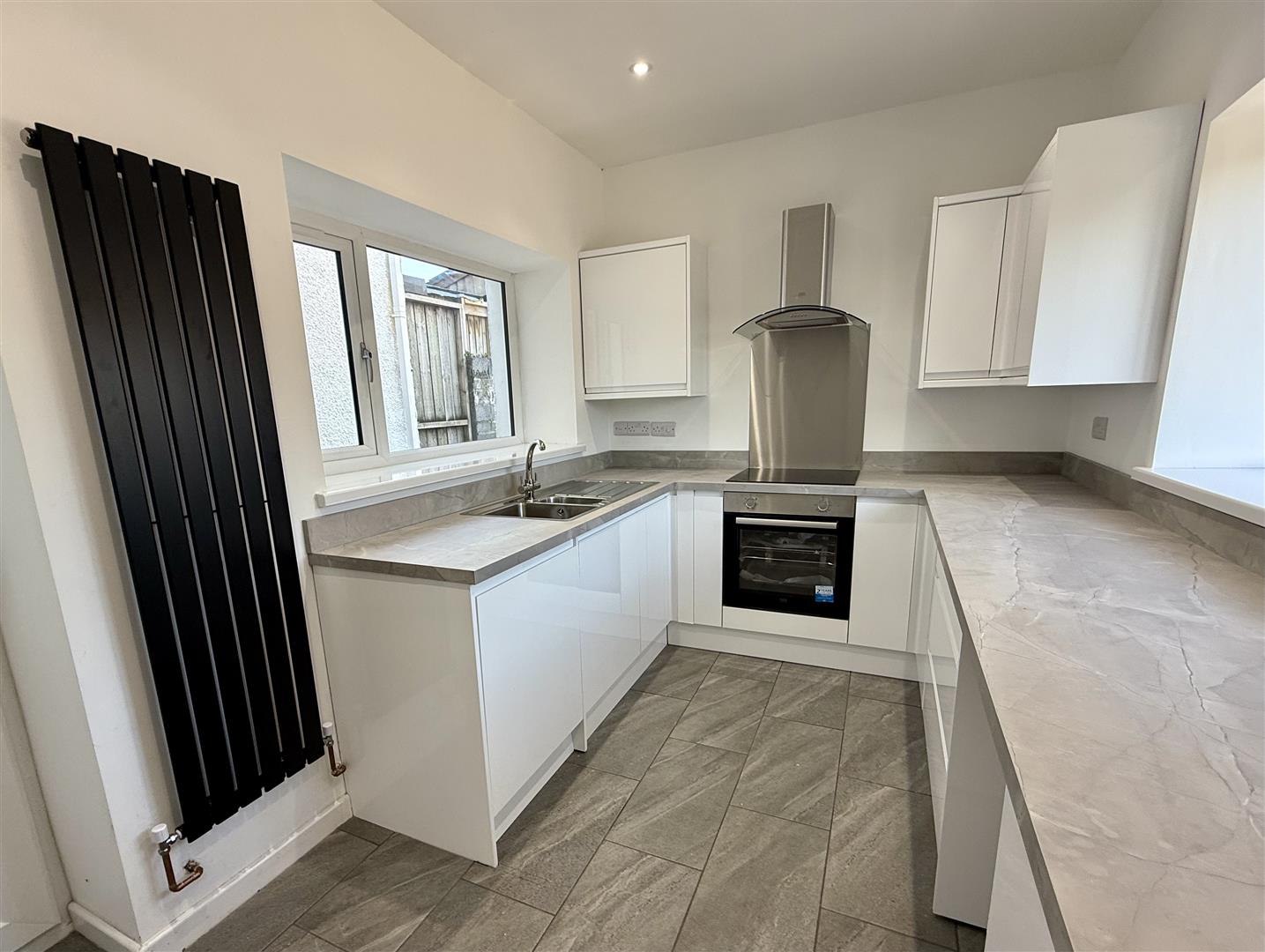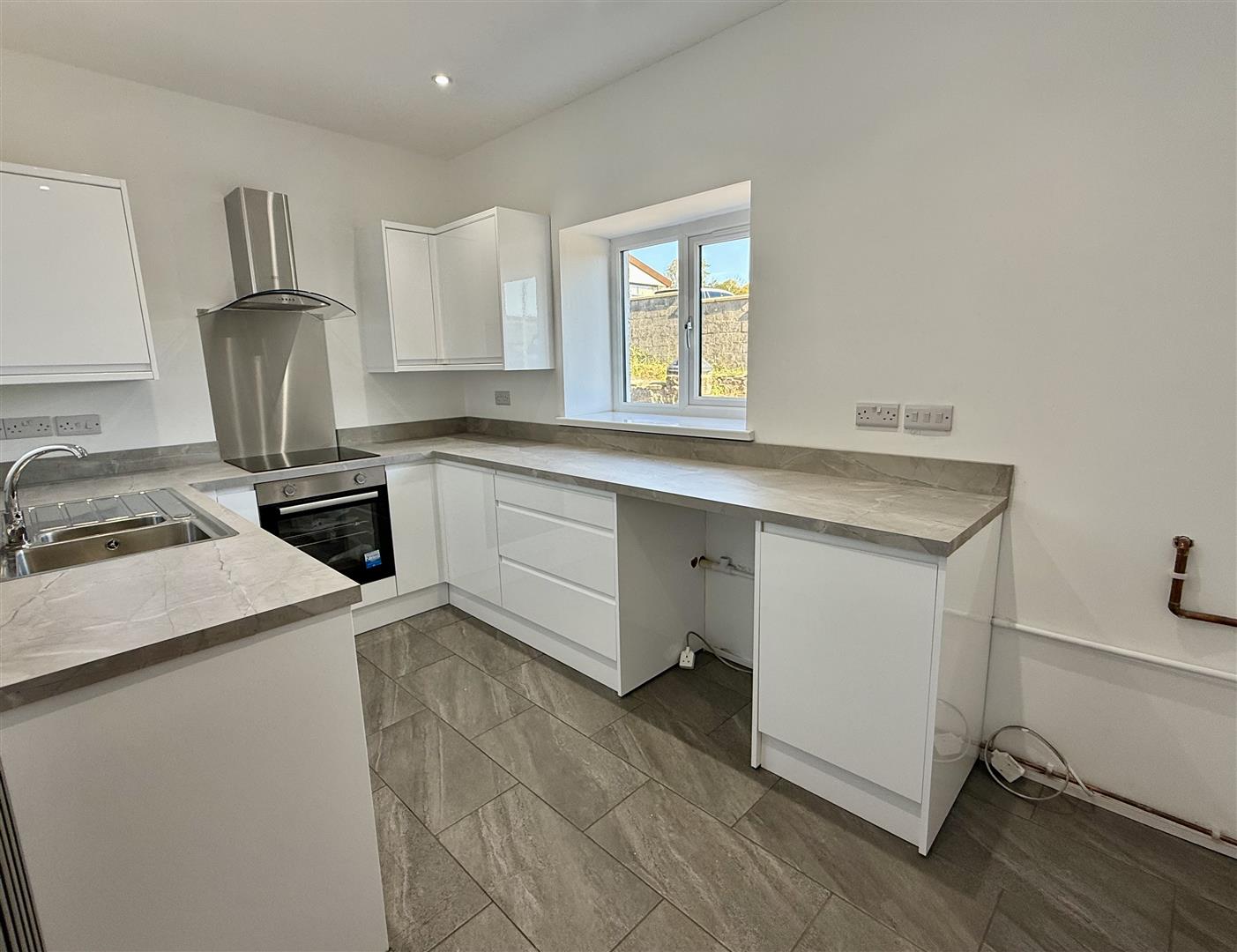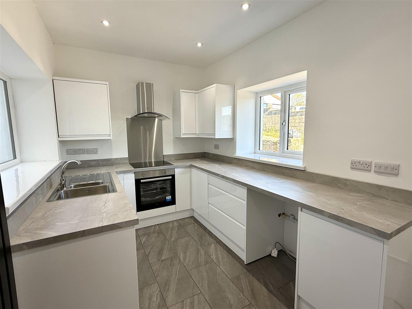 Brand new fitted kitchen with base and wall units with worksurface over, stainless steel sink with mixer tap and drainer. Electric oven and hob with extractor hood over, integrated dishwasher, plumbing for washing machine and space for fridge/ freezer. Two uPVC double glazed windows facing sides and door to rear garden.