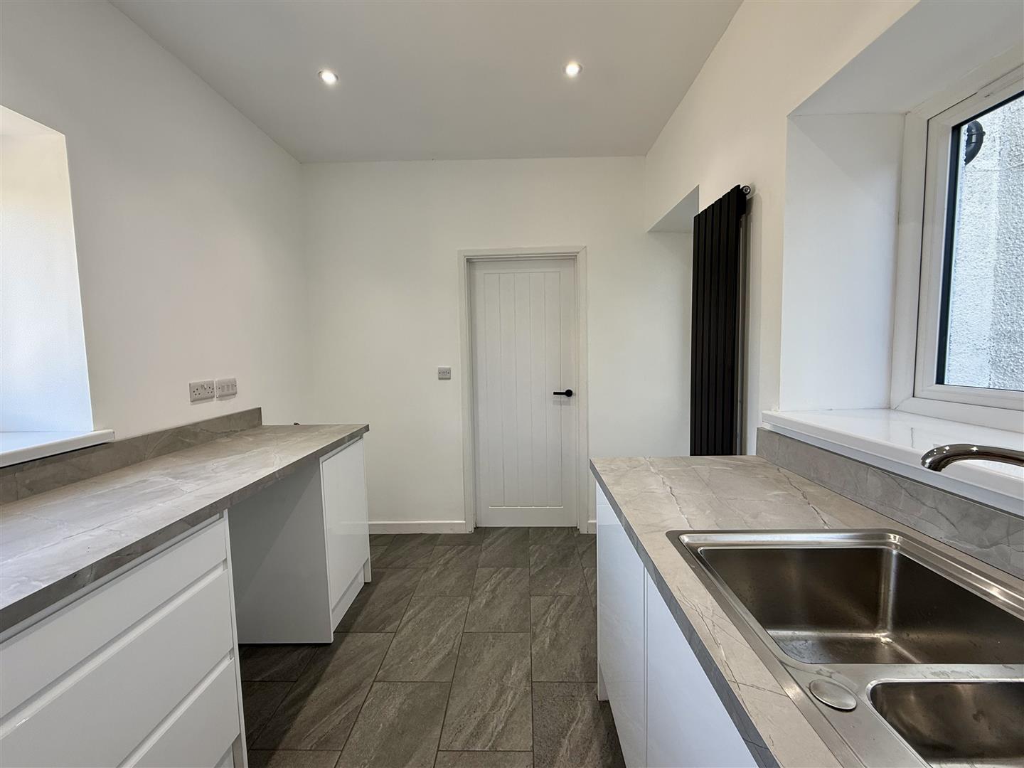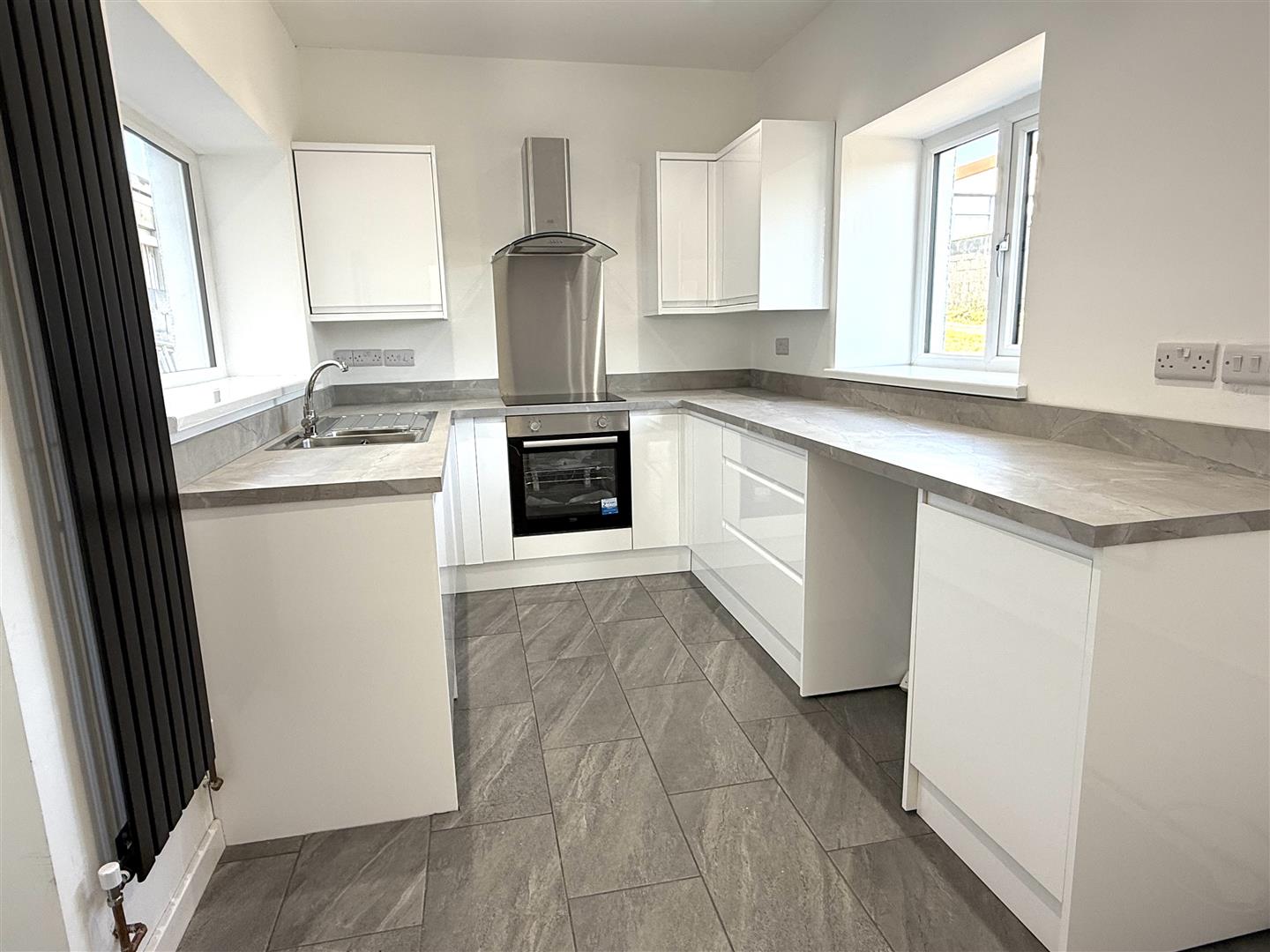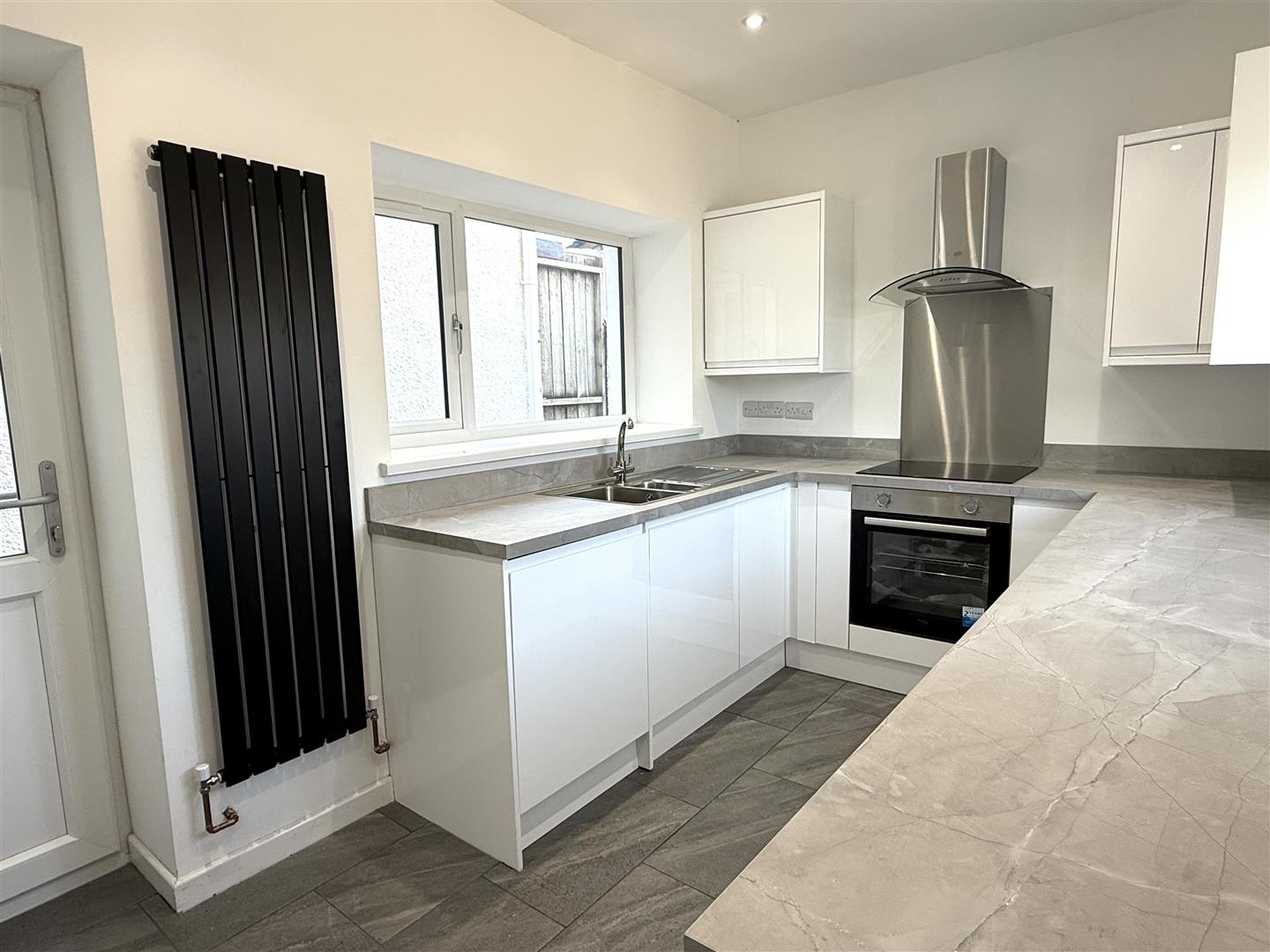 Brand new fitted kitchen with base and wall units with worksurface over, stainless steel sink with mixer tap and drainer. Electric oven and hob with extractor hood over, integrated dishwasher, plumbing for washing machine and space for fridge/ freezer. Two uPVC double glazed windows facing sides and door to rear garden.