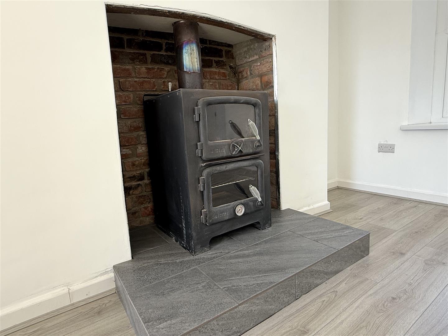 Two uPVC double glazed windows facing front and rear, two radiators, fireplace, understairs storage cupboard housing BAXI boiler.